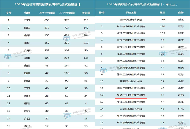 发明专利是衡量一所高职院校科研水平和创新能力的重要指标。近日,高职发展智库发布了《2020年全国高职院校发明专利授权排行榜》,我校排名全国12位,较去年全国排名25位有了显著提升。
